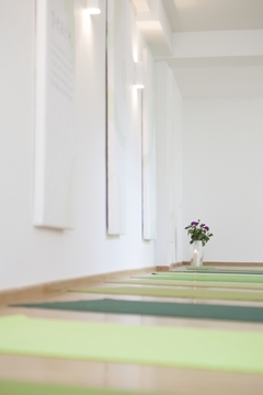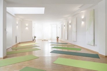 Ca. 70 qm Yogaraum, überdachte Eingangsterrasse, Empfangsbereich, Umkleiden, WC und Bad mit Dusche/WC.